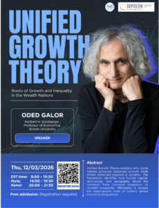 Workshop lần này sẽ giới thiệu về Lý thuyết Unified Growth Theory, tại đây, Giáo sư Oded Galor sẽ phân tích nguồn gốc lịch sử sâu xa của sự phát triển kinh tế, nhấn mạnh vai trò của nguồn vốn con người, thay đổi nhân khẩu học, tiến bộ công nghệ, cũng như các yếu tố văn hóa và địa lý trong việc hình thành các con đường phát triển khác nhau của mỗi quốc gia.